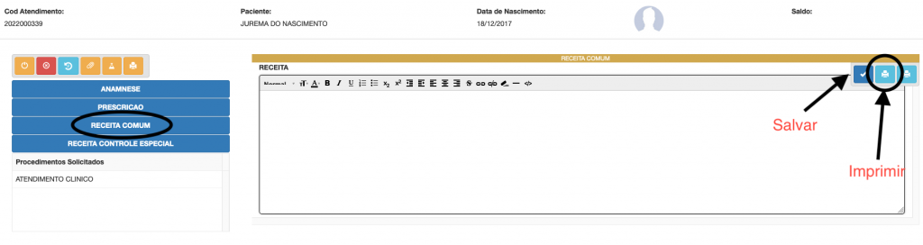 Após entrar na tela de consultório devemos selecionar a opção do lado esquerdo chamada de Receita Comum