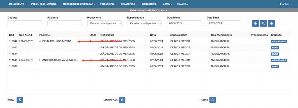 Na imagem abaixo, temos dois paciente aguardando atendimento, os mesmos estão ordenados por ordem de criação.